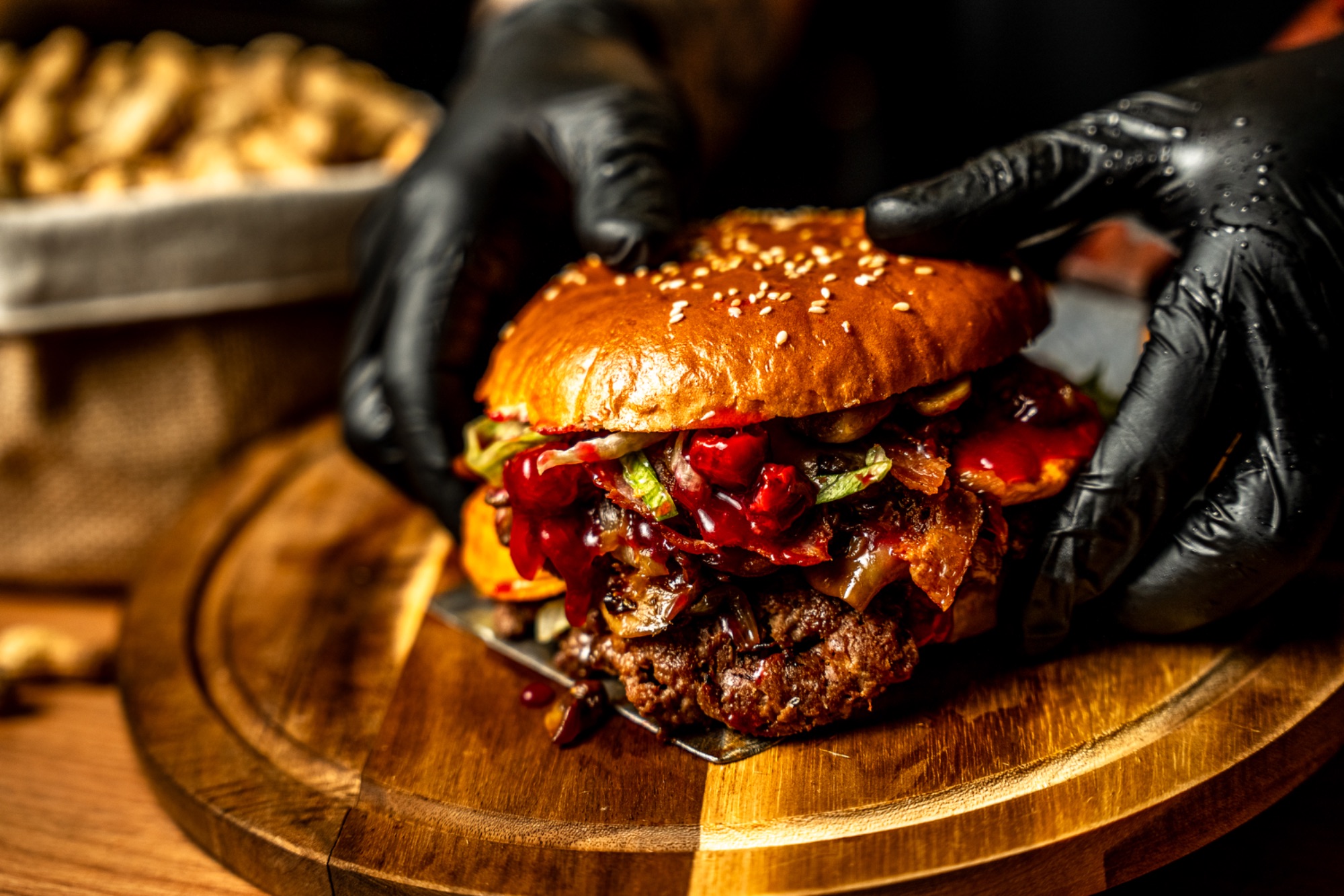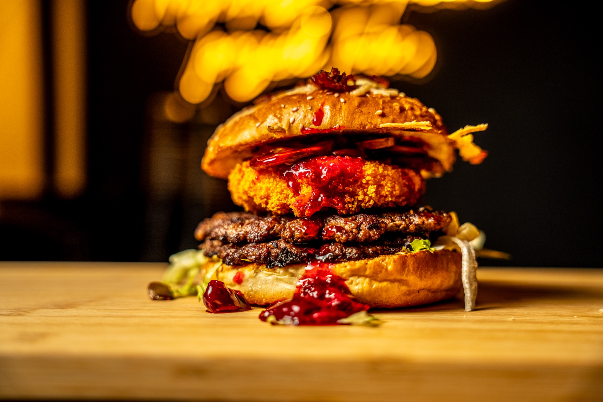 własnego wypieku bułka z boczkiem i serem, 100% wołowina x2, sos autorski aioli, sos wiśniowy, sałata, grillowane pieczarki, panierowany camembert -